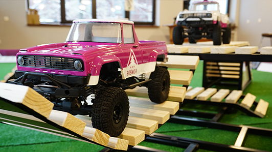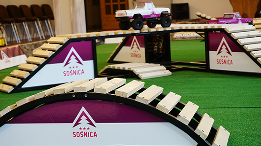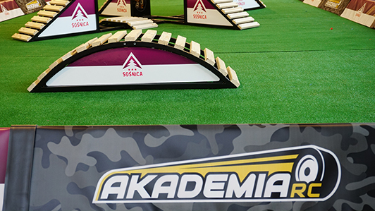 Modele w skali 1:10 są najczęściej spotykanymi w sklepach, jednak te używane w Akademii RC są w pełni wyczynowymi egzemplarzami o długości 54 cm i szerokości 23cm i prześwicie dochodzącym do 7,5 cm. Specjalnie dla nich zbudowaliśmy dowolnie konfigurowalny tor o szerokości 4m i długości 8m. Wyposażony w przeszkody wykonane ze specjalnie obrobionego metalu i drewna. To sprawia, że tor może być wykorzystywany w każdych warunkach. Zarówno wewnątrz sali konferencyjnej jak i na świeżym powietrzu. Całość dostarcza mnóstwo emocji i radości.