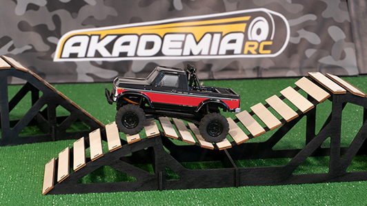 Akademia RC dysponuje również modelami w skali 1:24. 22 cm długości, 10 cm szerokości i 2,5 cm prześwitu sprawia, że te modele wydają się być małe i niepozorne, ale potrafią pozytywnie zaskoczyć niejednego entuzjastę jazdy w terenie i pokonywania przeszkód. Można je potraktować jako rozgrzewkę przed przesiadką na bardziej wymagające precyzji i koncentracji modele 1:10, jednak równie dobrze sprawują się jako uzupełnienie pełnej gamy modeli terenowych. Dla tych modeli Akademia RC przygotowała tor o wymiarach 2x4m z przeszkodami wykonanymi ze sklejki malowanej na czarno z surowymi deskami zapewnia estetyczny wygląd. Konstrukcja toru oraz modeli umożliwia korzystania z atrakcji wewnątrz budynku oraz na zewnątrz.